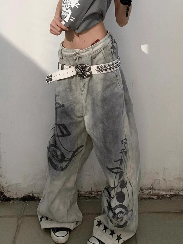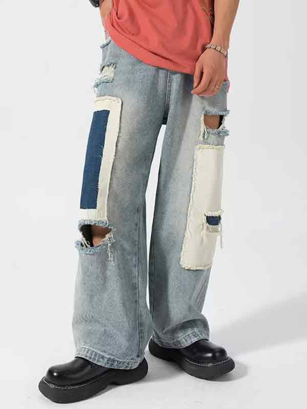 Lose Jeans für Herren im Vintage-Stil mit zerrissenen Aufnähern in Kontrastfarbe