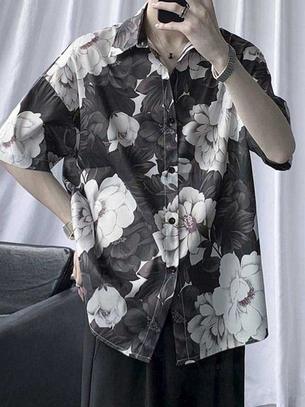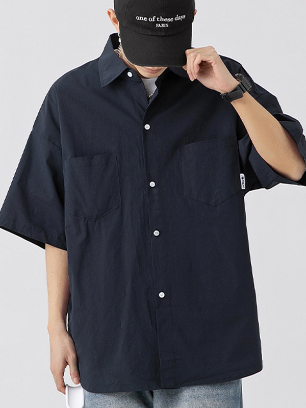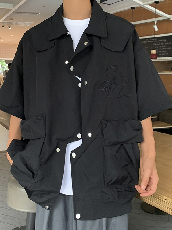 Herren-Bluse mit großen Taschen und Druckknöpfen, kurzärmelig, mit Stickerei