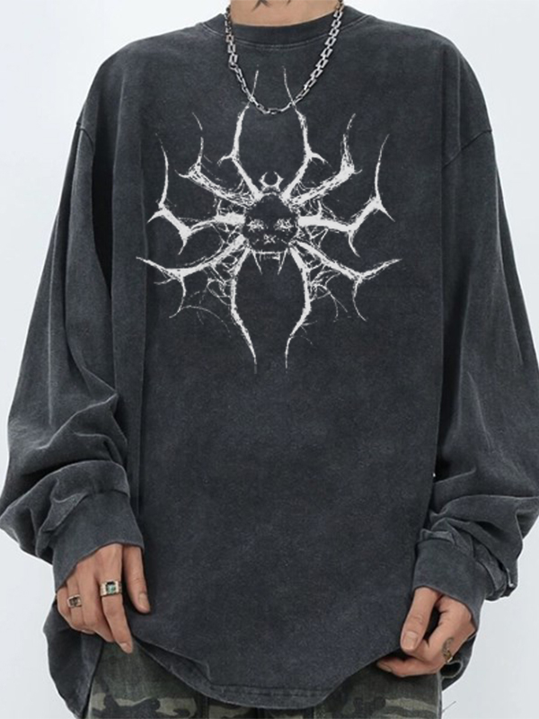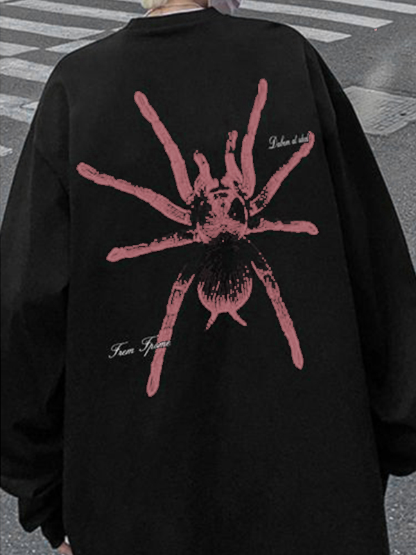 Lockeres, lässiges schwarzes Langarm-T-Shirt mit Spinnenmuster