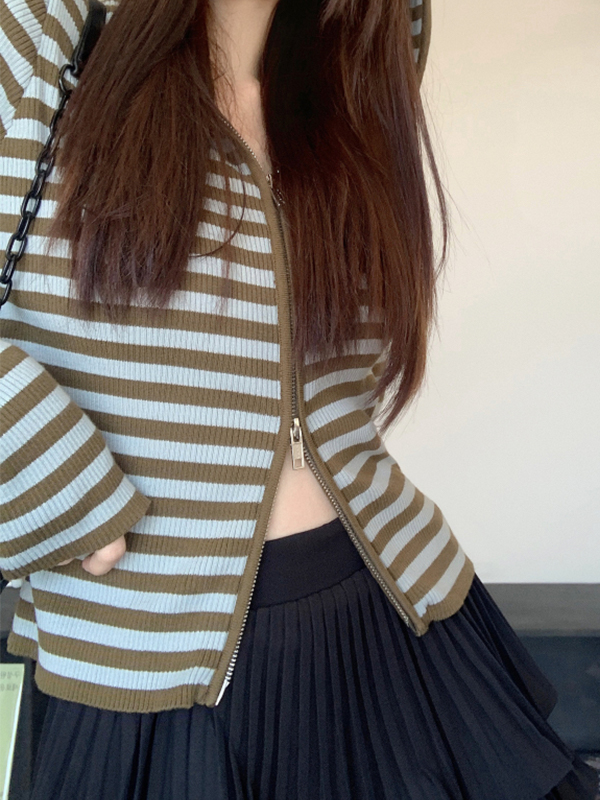 Kontrastfarben gestreifte Strickjacke mit Kapuze und doppeltem Reißverschluss