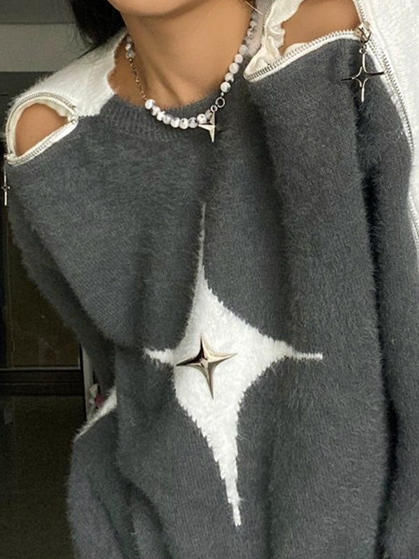 Lose Pullover mit Reißverschluss und Ausschnitt und Sternendekor