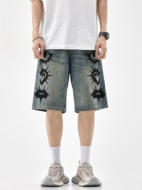 Lockere Jeansshorts für Herren mit Totenkopf- und Spinnen-Print