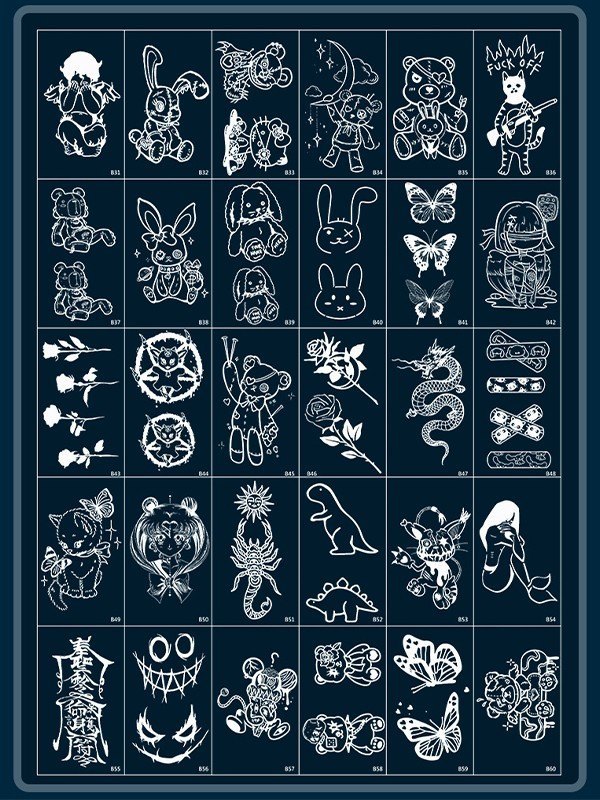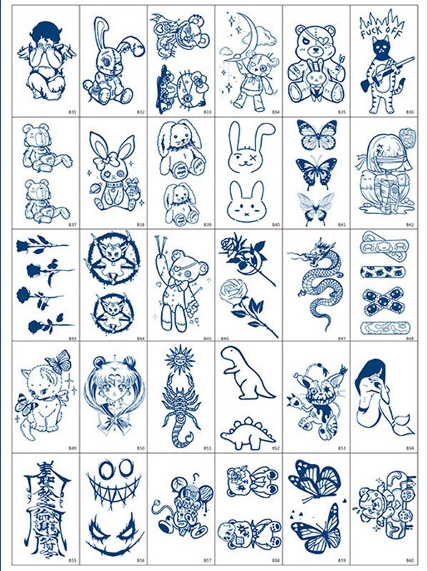 Stil: Casual/Street/Sweet/Punk/Hip Pop/Y2K/Grunge/SüßMustertyp: CartoonMenge: 30 BlattGröße: 5,7 cm x 9,8 cmTyp: Temporäres TattooAnlass: Festival/Club/Party/Urlaub/Ausgehen