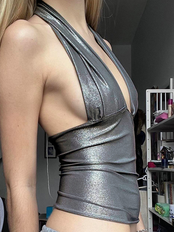 Glänzendes Neckholder-Top mit tiefem U-Ausschnitt und taillierter Taille